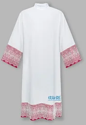 Alba wykończona jest gipiurą 20 cm i podbiciem koloru: amarantWysoka jakość wykonaniaNie gniecie sięŁatwa do prasowaniaSzybko i łatwo się pierze w temp. 40 st. C.Rozmiar alby dobieramy do aktualnego wzrostu.