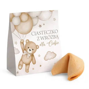 Ciasteczka z wróżbą z motywem beżowego misia z balonikami to pełen uroku prezent, który doda ciepła i radości każdemu przyjęciu. Zestaw zawiera 12 delikatnych ciasteczek w złotej folii, ozdobionych subtelnymi tekturkami z dziecięcym motywem. Wewnątrz każdego ciasteczka ukryta jest pozytywna wróżba – drobny gest, który sprawi przyjemność i pozostawi miłe wspomnienie. Opis: skład: 12szt ciasteczek z wróżbą o smaku kruchego herbatnika umieszczonych w złotej metalicznej folii i zapakowanych w tekturki z motywem beżowego misia z balonikami spięte zszywką, ciasteczka są opakowane jak na zdjęciu - gotowe do wręczenia najbliższym; po przełamaniu oczom gościa ukaże się wróżba na małym kawałku papieru wróżby są wkładane do ciasteczek losowo, nadrukowane w języku polskim i angielskim, nie powtarzają się, wszystkie są pozytywne i dobrze wróżą: -) przykładowe wróżby: