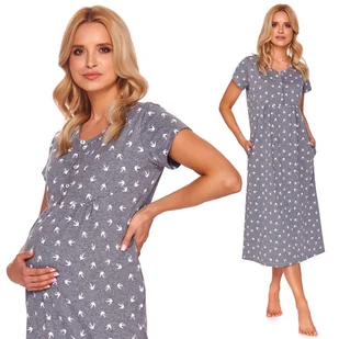 Piękna koszula nocna, o kroju uroczej sukienki. Wzór w jaskółki. Przeznaczona dla kobiet w każdym wieku, nie tylko dla kobiet w ciąży czy mam karmiących - świetnie układa się również bez brzuszka. Koszula rozpinana na napy dzięki czemu możliwe jest karmienie maleństwa. Dół koszulki rozkloszowany, z kieszeniami po bokach.