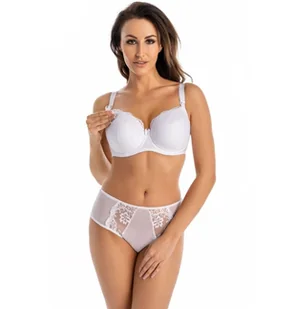 - Biustonosz do karmienia usztywniany z fiszbinami- Usztywniany, posiada regulowane ramiączka- Koronka o motywie kwiatowym zdobi miski - Biustonosz dla matek karmiących w białym kolorze
