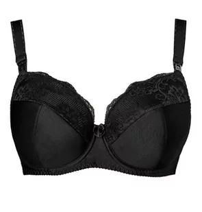 - Biustonosz dla mam karmiących w kolorze czarnym- Usztywniany, z fiszbinami- Miski zdobione koronką o motywie kwiatowym- Biustonosz do karmienia posiada regulowane ramiączka