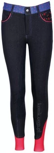 Młodzieżowe bryczesy z pełnym lejem wykonane z bardzo elastycznego materiału przypominającego wyglądem jeans. Na zakończeniach nogawek wstawki z elastycznego materiału dla zwiększenia wygody.