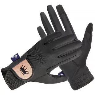 Eleganckie rękawiczki wykonane z antypoślizgowego materiału. Na rzepie posiadają haft korony na brokatowym tle. Na kciuku i palcu wskazującym wstawka z materiału umożliwiającego korzystanie z ekranów dotykowych.