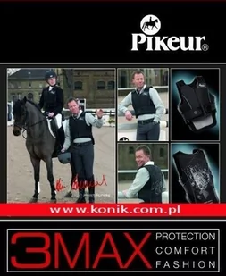 Kamizelka ochronna firmy Pikeur model 3Max, testowana i polecana przez zawodnika WKKW Hinrich''a Romeike''a. Kamizelka 3Max zapewnia maksymalną ochronę i bezpieczeństwa dla jeźdźca, jest komfortowa, jednocześnie zachowuje elegancki wygląd. Kamizelka nadaje się zarówno na zawody, jak i do jazdy w terenie. Zapewnia maksymalną swobodę ruchów. Pod wpływam ciepła emanowanego przez ciało, dopasowuje się do niego.
