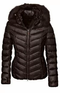 Piękna i ciepła, kurtka puchowa. Szlachetny, przyjemny w dotyku materiał, eleganckie sztuczne futro na kapturze. Futerko oraz kaptur można odpiąć. Zamki wykończone piękną przywieszką. Skośne pikowanie i taliowany krój podkreślają sylwetkę.