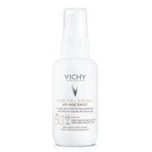 Potwierdzona klinicznie skuteczność korygująca oznaki fotostarzenia, w tym przebarwienia i brak jędrności. Jego formuła zapewnia lekkie krycie, ujednolicając i poprawiając koloryt skóry. Zawiera 4% peptydów, działających przeciwzmarszczkowo, 2% niacynamidu, aby zapobiegać przebarwieniom, frakcje probiotyczne oraz wodę wulkaniczną Vichy, bogatą w 15 minerałów, aby wzmacniać barierę skórną. UV-AGE DAILY jest odpowiedni dla każdego typu skóry. Hipoalergiczny. Nie szczypie w oczy.