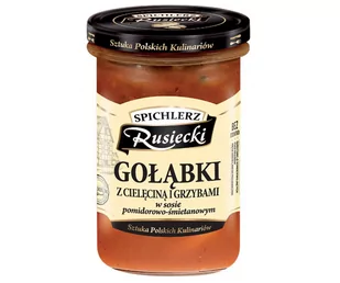 Spichlerz Rusiecki Gołąbki w sosie pomidorowo-śmietanowym 470 g Gołąbki z cielęciną i grzybami w sosie pomidorowo - śmietanowym. Składniki: Sos pomidorowo-śm...
