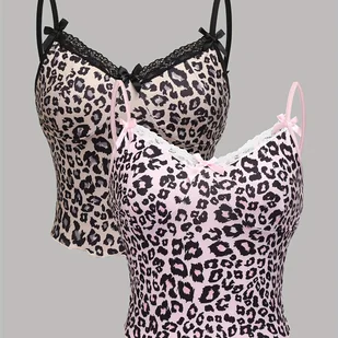 2-pakietowe topy z kontrastową koronką w panterkę, urocze bezrękawniki na ramiączkach spaghetti z kokardką, dopasowane topy, odzież damska