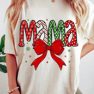 Koszulka świąteczna Mama dla kobiet - swobodna dzianina poliestrowa z okrągłym dekoltem - świąteczny nadruk - przez cały rok - regularny krój