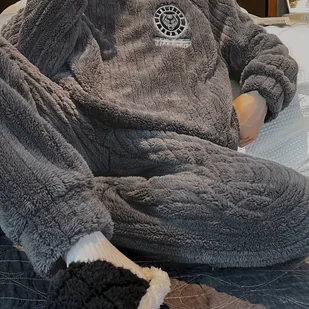 TEMU Męski minimalistyczny zestaw piżamowy, ciepła flanelowa odzież domowa, z długim rękawem i okrągłym dekoltem, z nadrukiem tygrysa i luźnymi