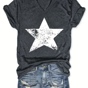T-shirt z nadrukiem gwiazdy, dekolt w szpic, swobodna koszulka z krótkim rękawem na wiosnę i lato, odzież damska