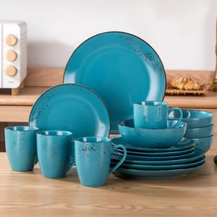TEMU 16-częściowy serwis obiadowy z kamionki z motywem natryskowym, w skład którego wchodzą talerze obiadowe, talerze do sałatek, miski i kubki,