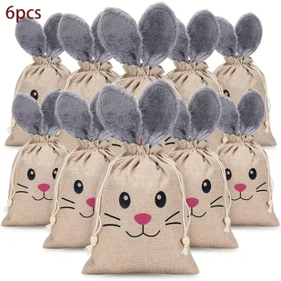 TEMU 6szt. Wielkanocne Torby z Uszami Królika na Sznurku - Lniane Woreczki na Cukierki i Prezenty, Przechowywanie Opakowań Prezentowych