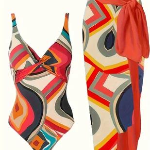 TEMU Abstrakcyjny geometryczny nadruk 2-częściowe kostiumy kąpielowe, jednoczęściowy kostium kąpielowy z wycięciem w serek i spódnicą, damskie stroje