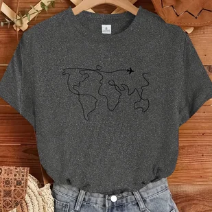 TEMU Damska T-shirt z okrągłym dekoltem i wyjątkowym nadrukiem mapy samolotu - Świeżożółta, nadaje się do prania w pralce, idealna na wiosnę i ,