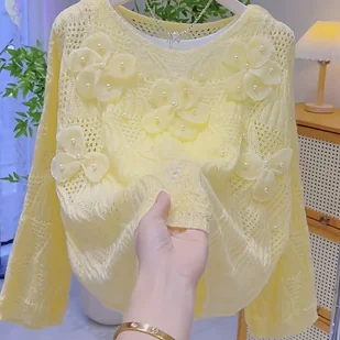 TEMU Damski lekki wiosenny sweter z 3D kwiatowymi koronkami - Oddychająca, przezroczysta dzianinowa bluza w stylu francuskim z eleganckimi wzorami