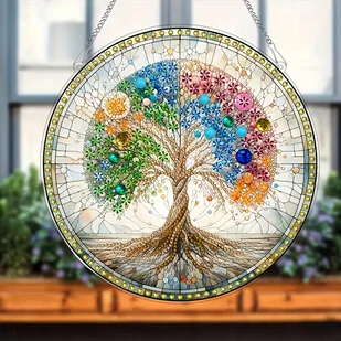 TEMU DIY 2D płaski zestaw do malowania diamentów, Drzewo czterech pór roku, Diamenty w kształcie nieregularnym, Akrylowy wisiorek, Idealny na Dzień