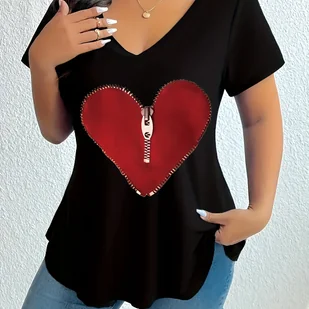 TEMU Elegancka koszulka z dekoltem w kształcie litery V w rozmiarze plus dla kobiet z nadrukiem w kształcie czerwonego - wygodna, luźna koszulka z