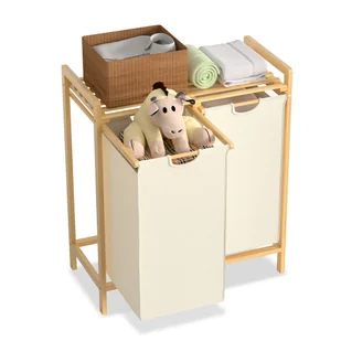 TEMU Bambusowy Kosz na Pranie z Dwoma Przegródkami, z Półką i Wyjmowanymi Workami do Organizacji Prania w Sypialni lub Pralni, Kosze na Bieliznę