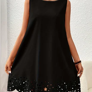TEMU Letnia Sukienka Damska Bez Rękawów - Czarna, A-Line z Wycięciami, Okrągły Dekolt i Luźny Fason na Codzienne lub Formalne Wyjścia, Elegancka