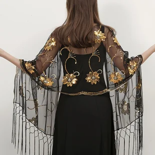 TEMU Plus Size Elegancki Złoty Szal z Cekinami i Frędzlami dla Kobiet - Lekki, Półprzezroczysty Poliestrowy Wieczorowy Owijacz na Wesela, Galę