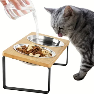 TEMU Podwójna Miska dla Kota z Materiału Bambusowego i Stali Nierdzewnej Chroni Kręgosłup Szyjny Kota, Miska na Karmę i Wodę dla Kota, Stacja