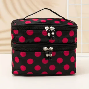 TEMU Wytrzymała Kosmetyczka z Podwójnym Zamkiem - Czarna z Czerwonymi Groszkami, Wieloprzegrodowy Organizer Podróżny na Kosmetyki i Makijaż, Dla