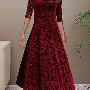 TEMU Plus Size - , dopasowana długa sukienka z aksamitu dla kobiet z rozkloszowaną spódnicą i długimi rękawami.