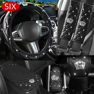 TEMU Stylowy 6-częściowy zestaw pokrowców na kierownicę samochodu z koroną, 15 cali, zawiera pokrowiec na podłokietnik, pokrowiec na hamulec ręczny,